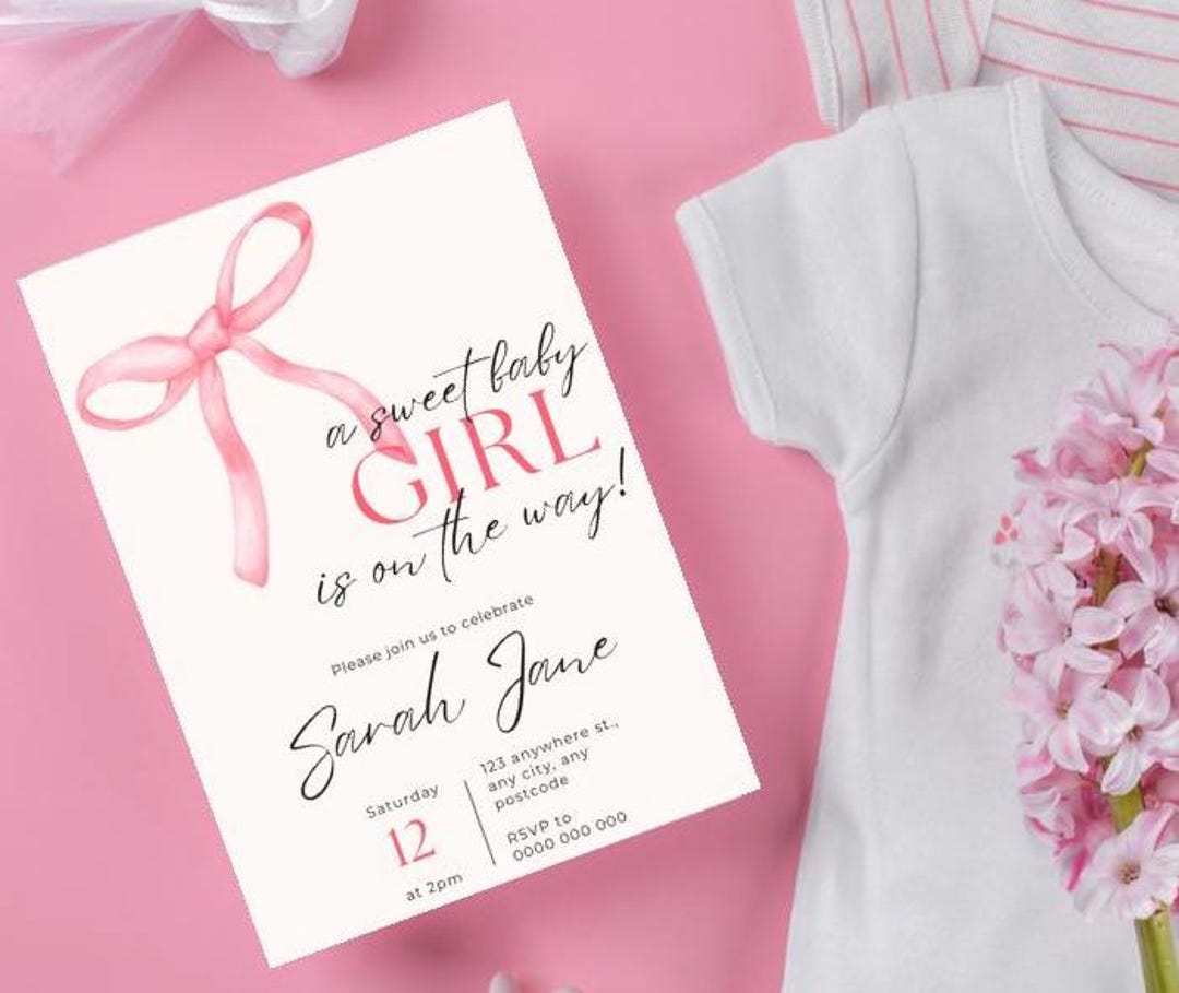 Editable Baby Shower Invitation, Baby Girl Shower Invitation, Pink Bows ...