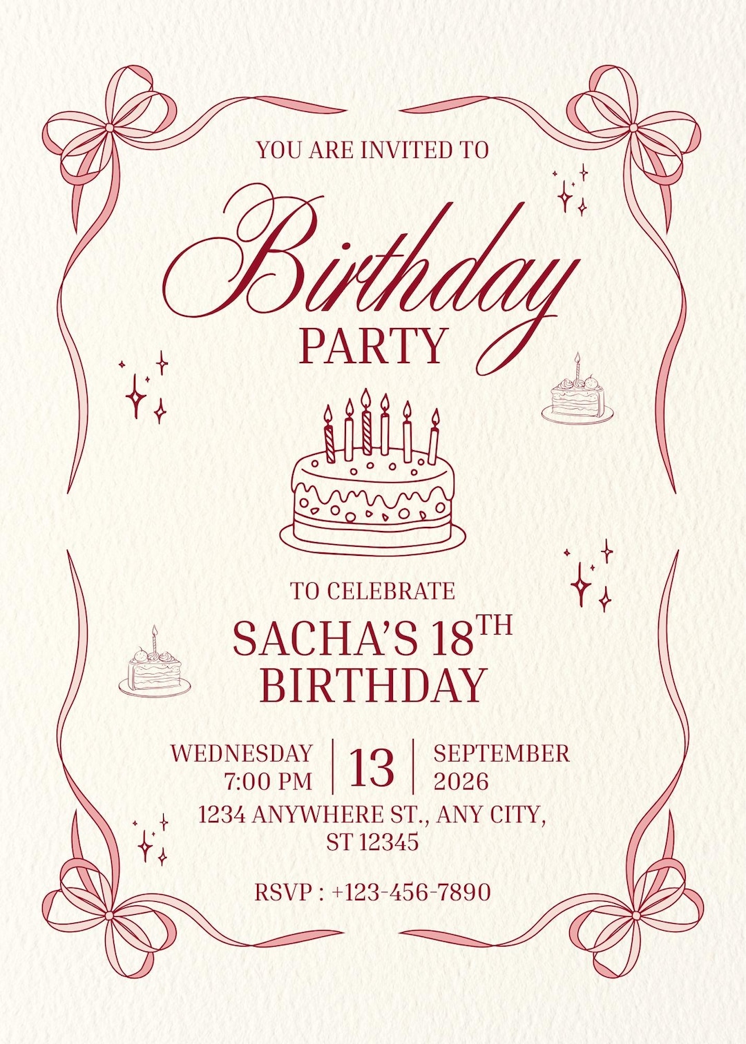 Pink Ribbon Minimal Birthday Invitation Template | Coquette Birthday ...