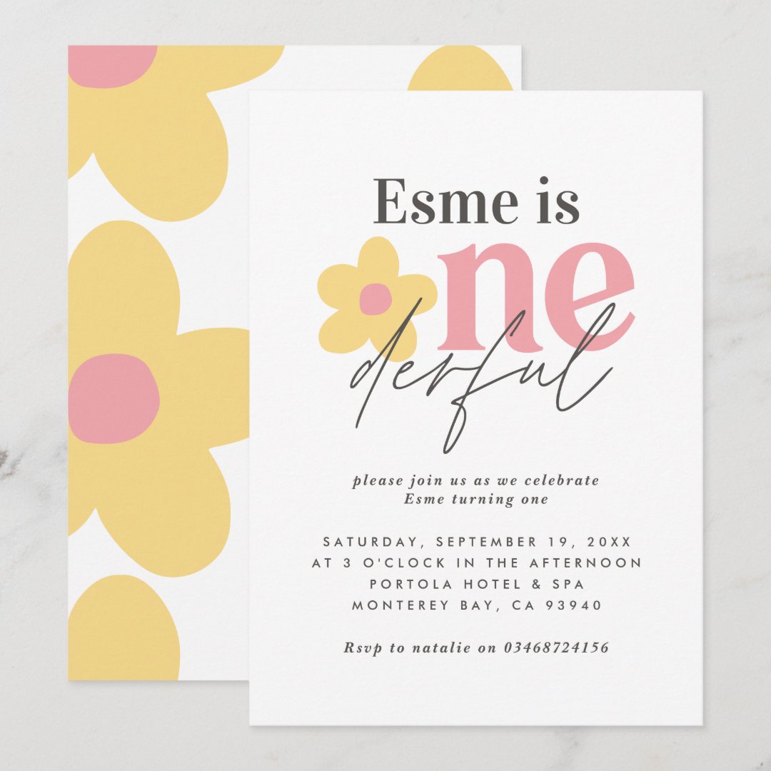 First birthday daisy boho retro pink yellow girly invitation | Zazzle