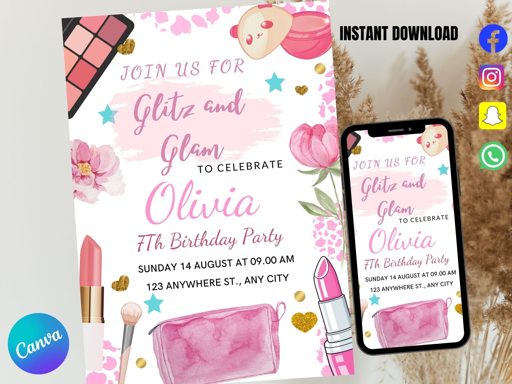 Editable Glitz and Glam Birthday Party Invitation, Glamour Makeup Girls ...