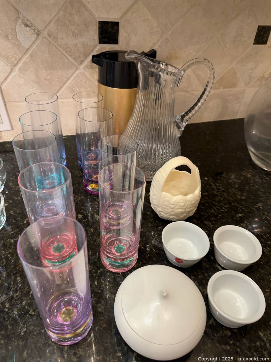 Mixed glassware, bowls, pitcher, thermos, ceramic pieces | Maxsold