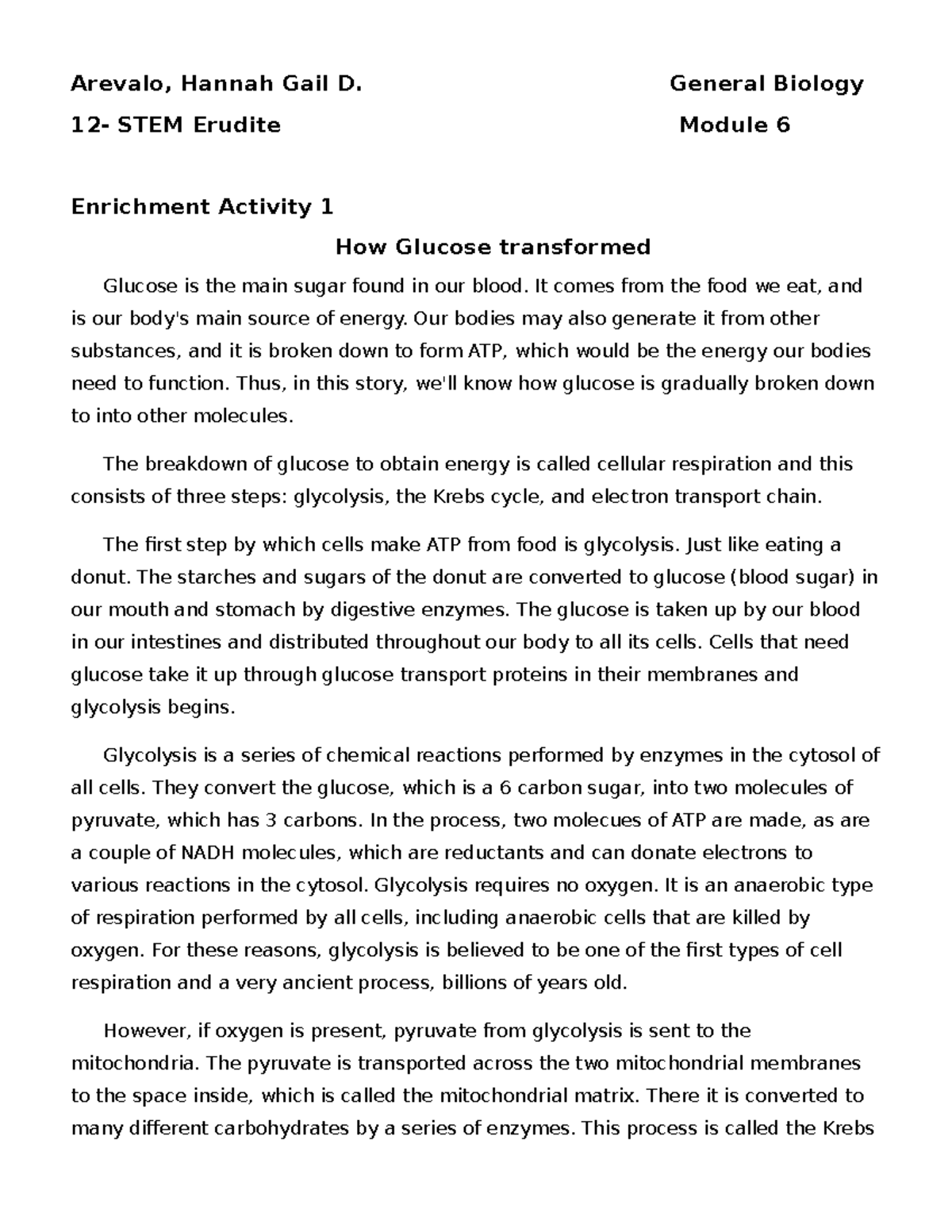 Story of glucose - Arevalo, Hannah Gail D. General Biology 12- STEM ...