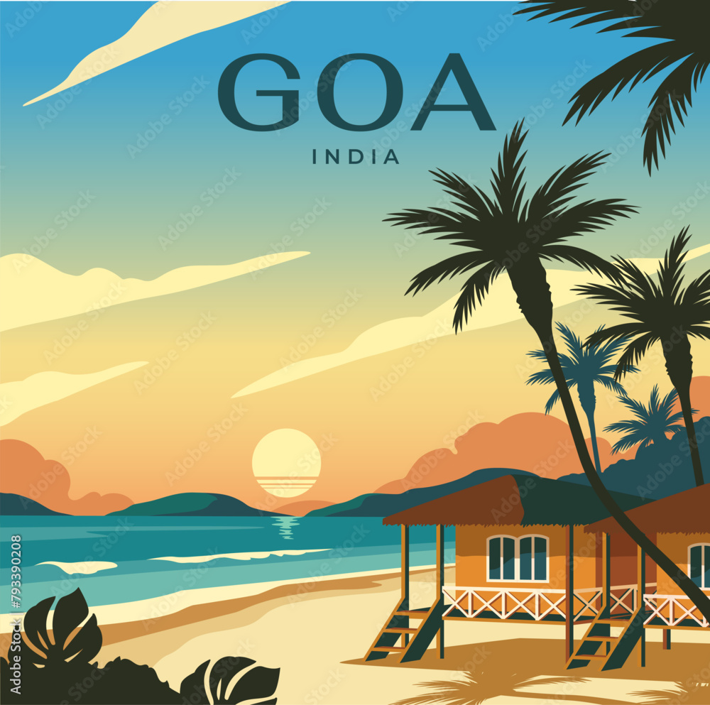 Goa beach retro poster. Goa travel illustration. States of India ...