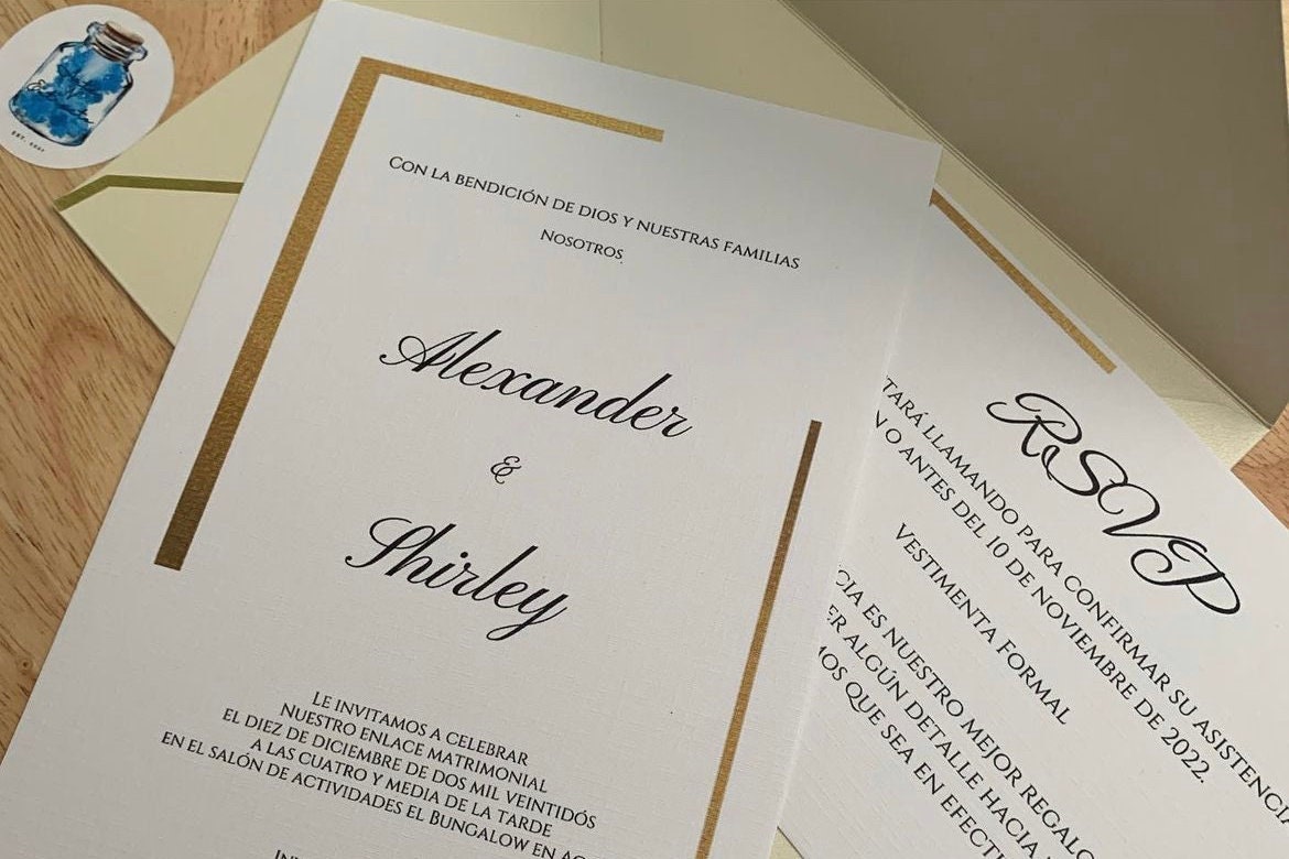 Vinas invitation. Gold emboss. Gold font. White gold classic. Classic ...