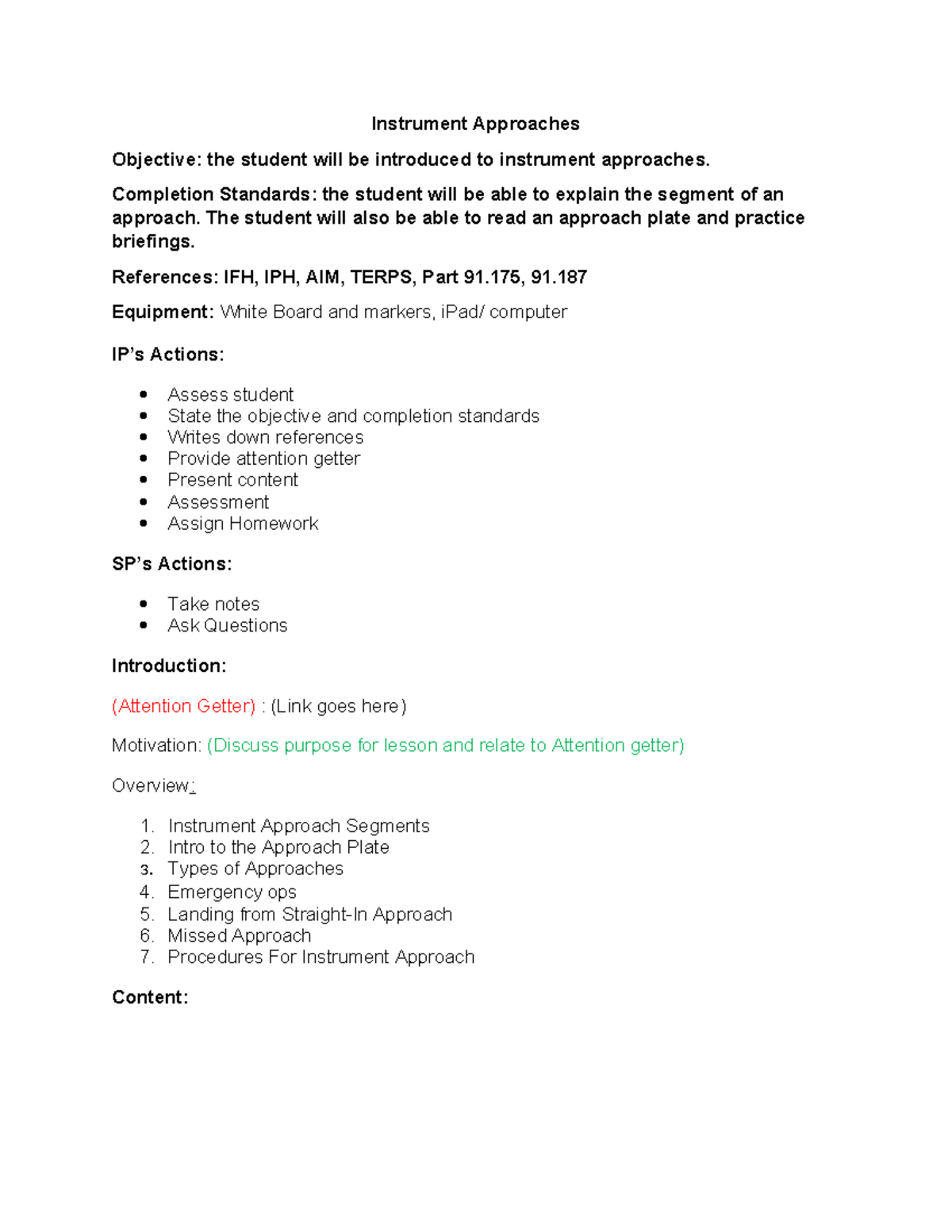 Approaches - n/a - Instrument Approaches Objective: the student will be ...