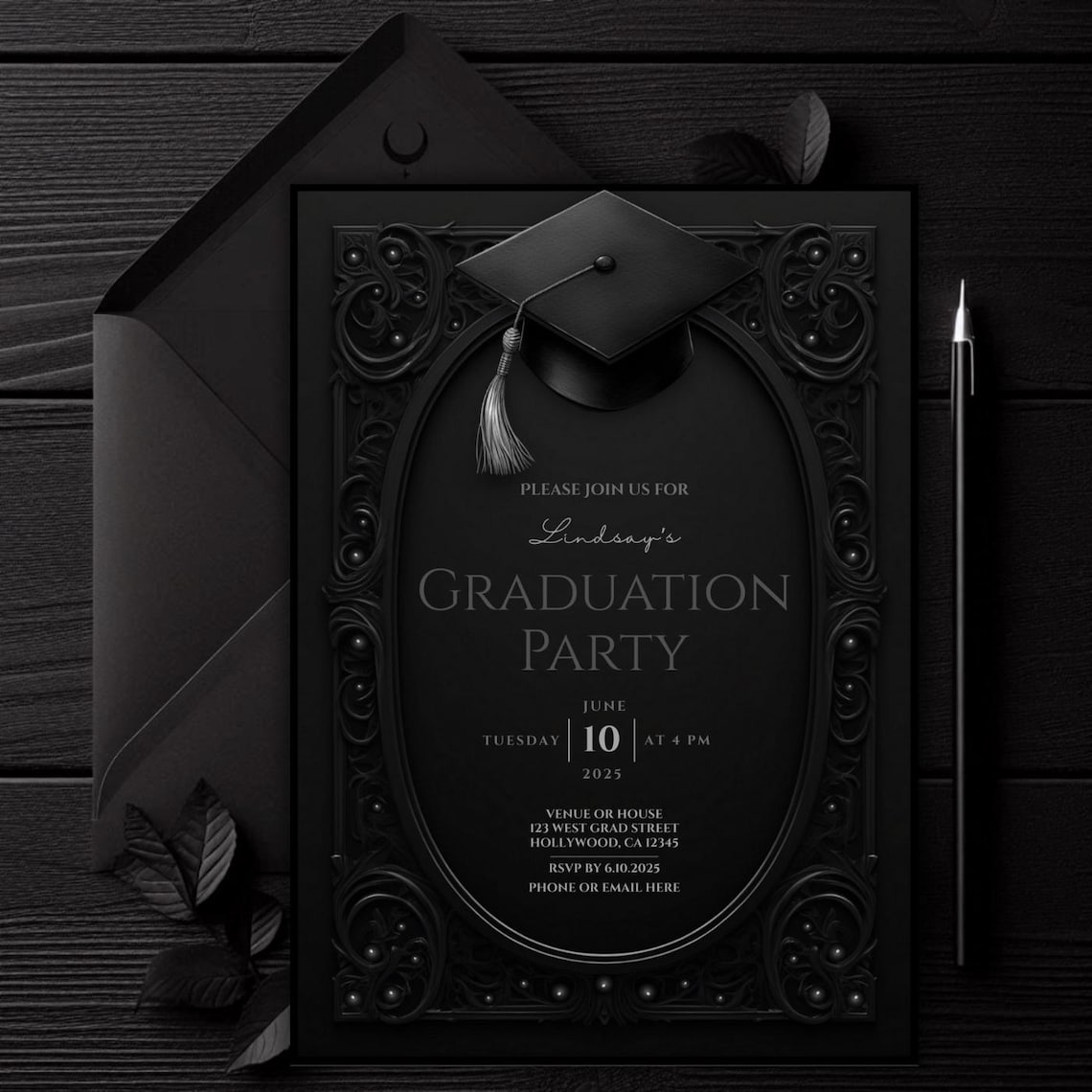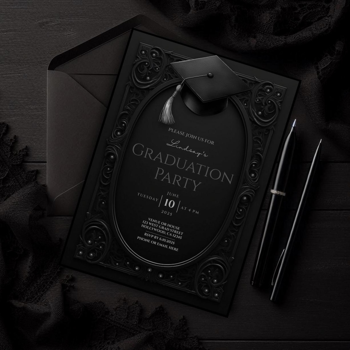 Editable All Black Graduation Party Invitation, Printable Dark ...