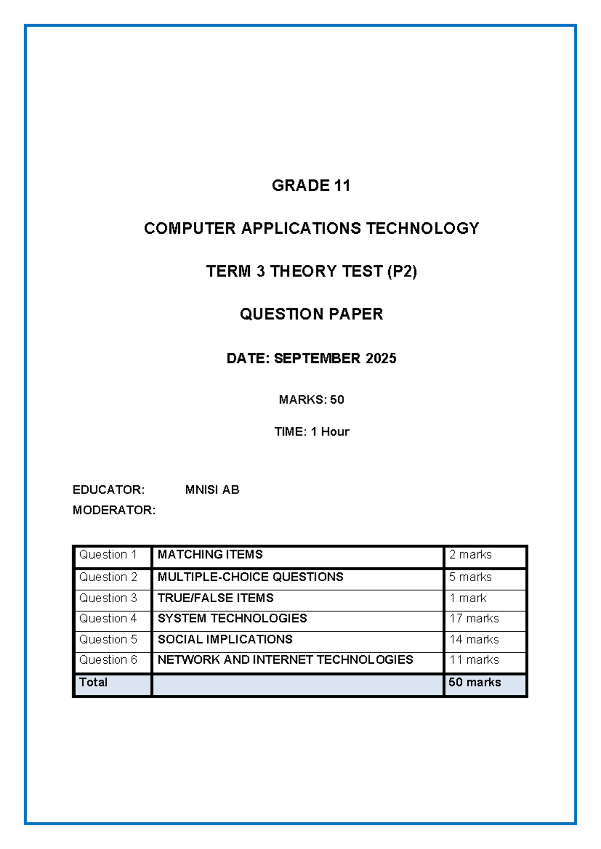 GRADE 11 COMPUTER APPLICATIONS TECHNOLOGY TERM 3 THEORY TEST (P2) - Studocu