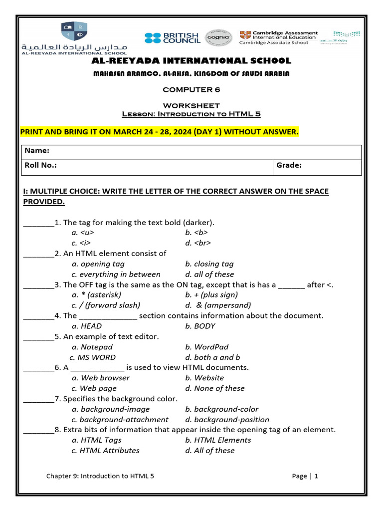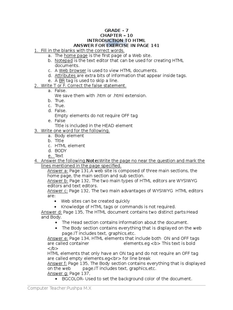 HTML Worksheet for Class 7 | PDF | Html Element | Hyperlink