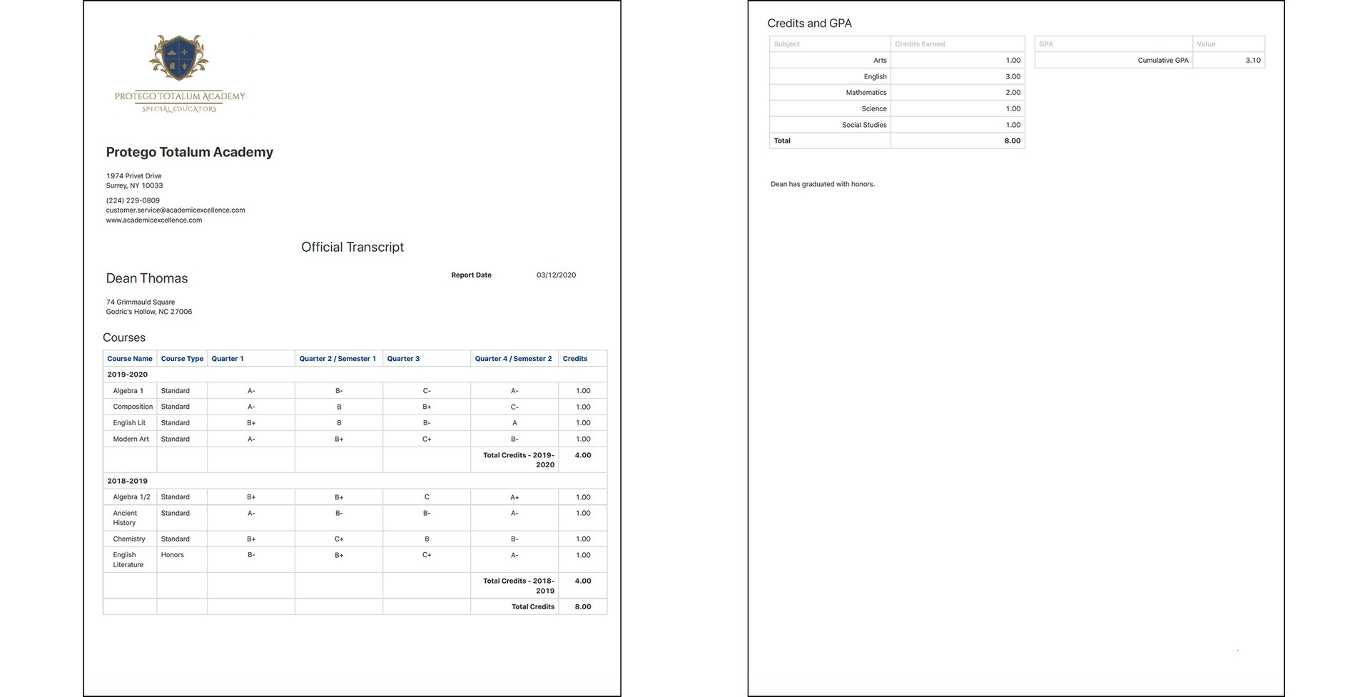 9th and 10th Grade Transcripts | PDF