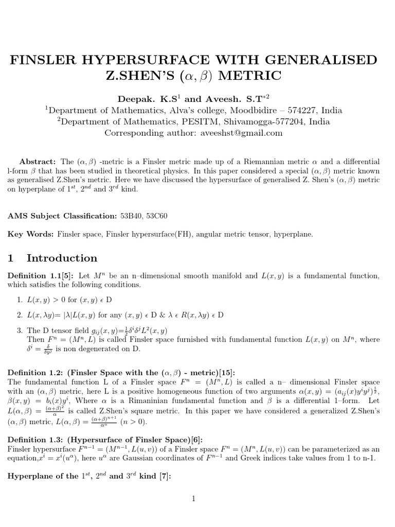 Finsler Hypersurface With Generalised z. Shen's (α,β) Metric 1 Final ...