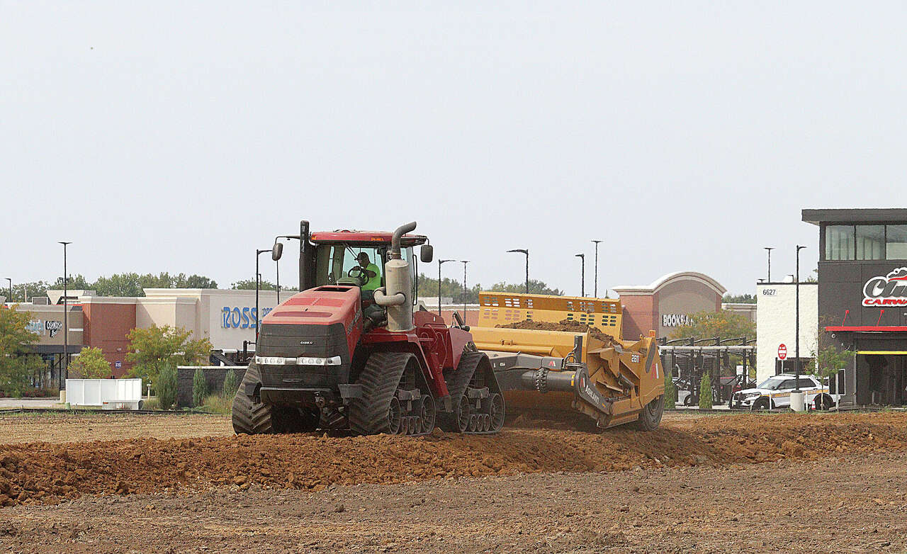 Skid steer grading wet soil in residential yard with arborvitae Stock ...