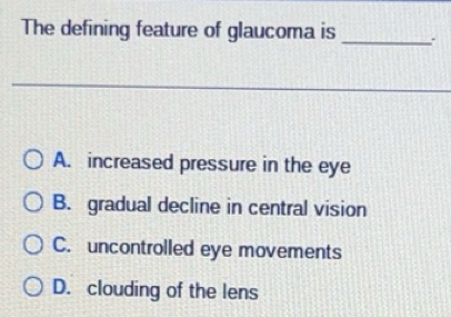 Solved: The defining feature of glaucoma is _ A. increased pressure in ...