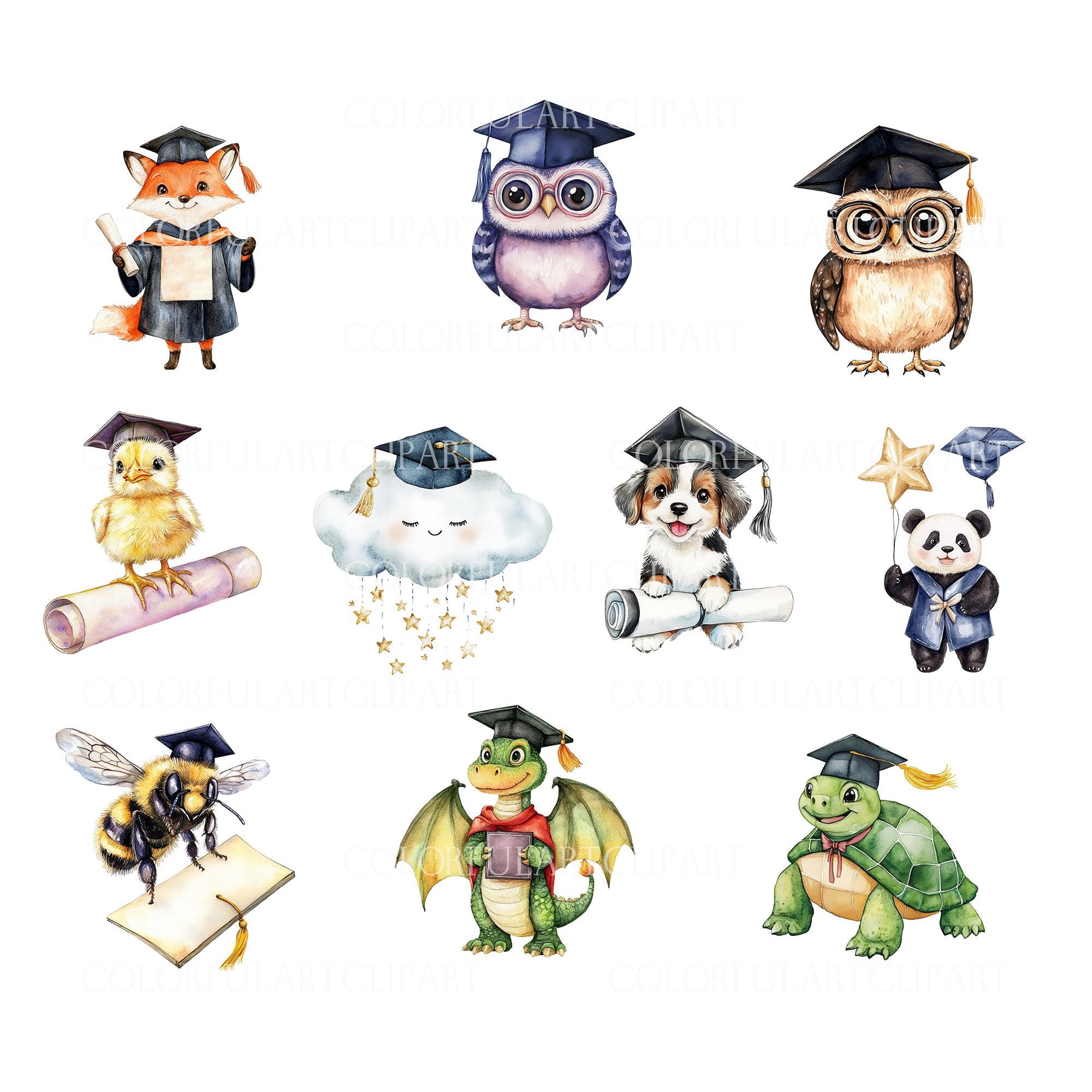 Animals Graduation Clipart, Watercolor Cute Graduation Animals Clipart ...