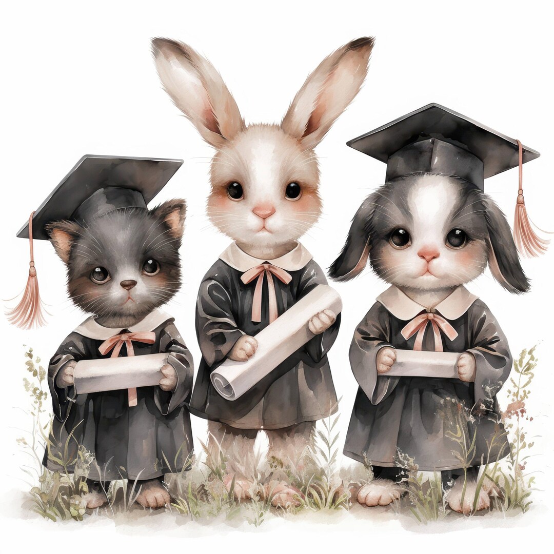 6 Graduation Animal Friends Clipart, Watercolor Rabbits, Cats & Dogs in ...