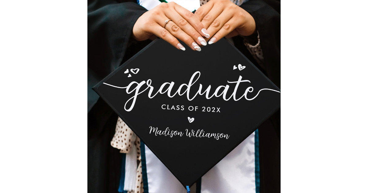 Black Modern Chic Elegant Script Hearts Name Class Graduation Cap ...
