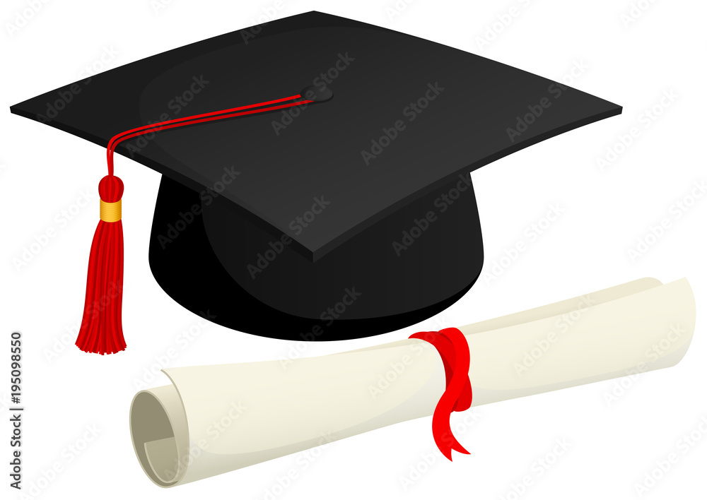 Graduation cap and diploma illustration on white background, graduation ...