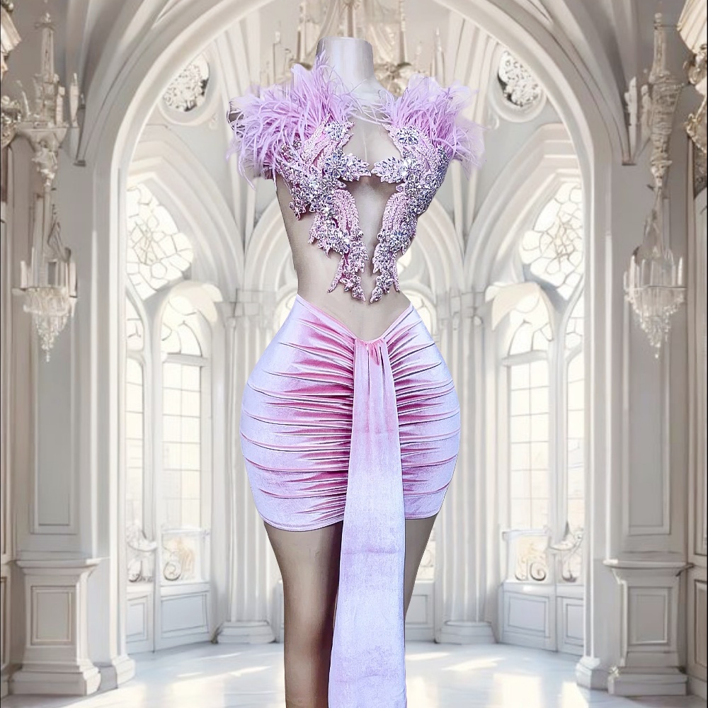 Pink Feather Short Homecoming Dresses Crew Neckline Illusion Lace ...