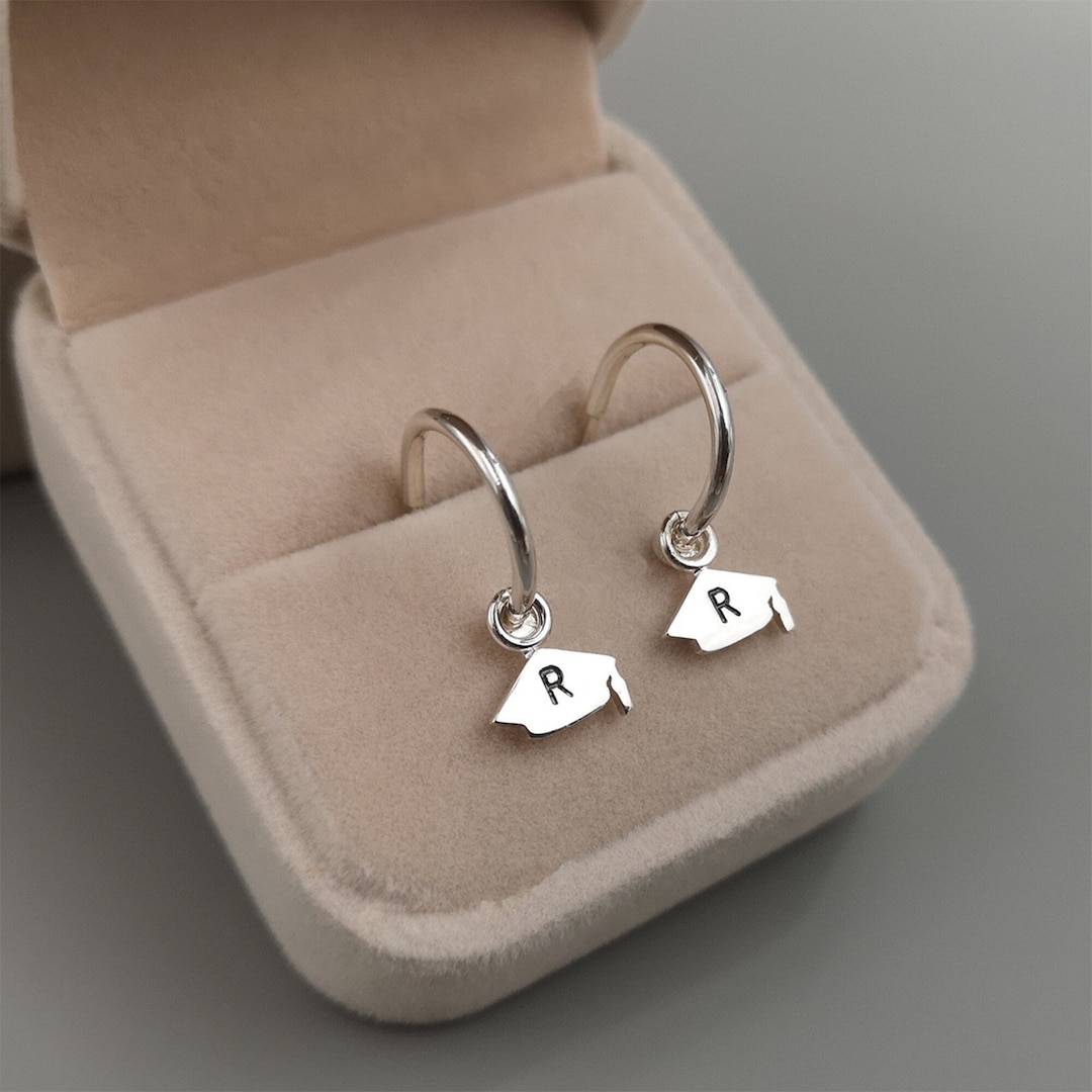 Graduation Cap Hoop Earrings Sterling Silver, Gold Free Initial ...