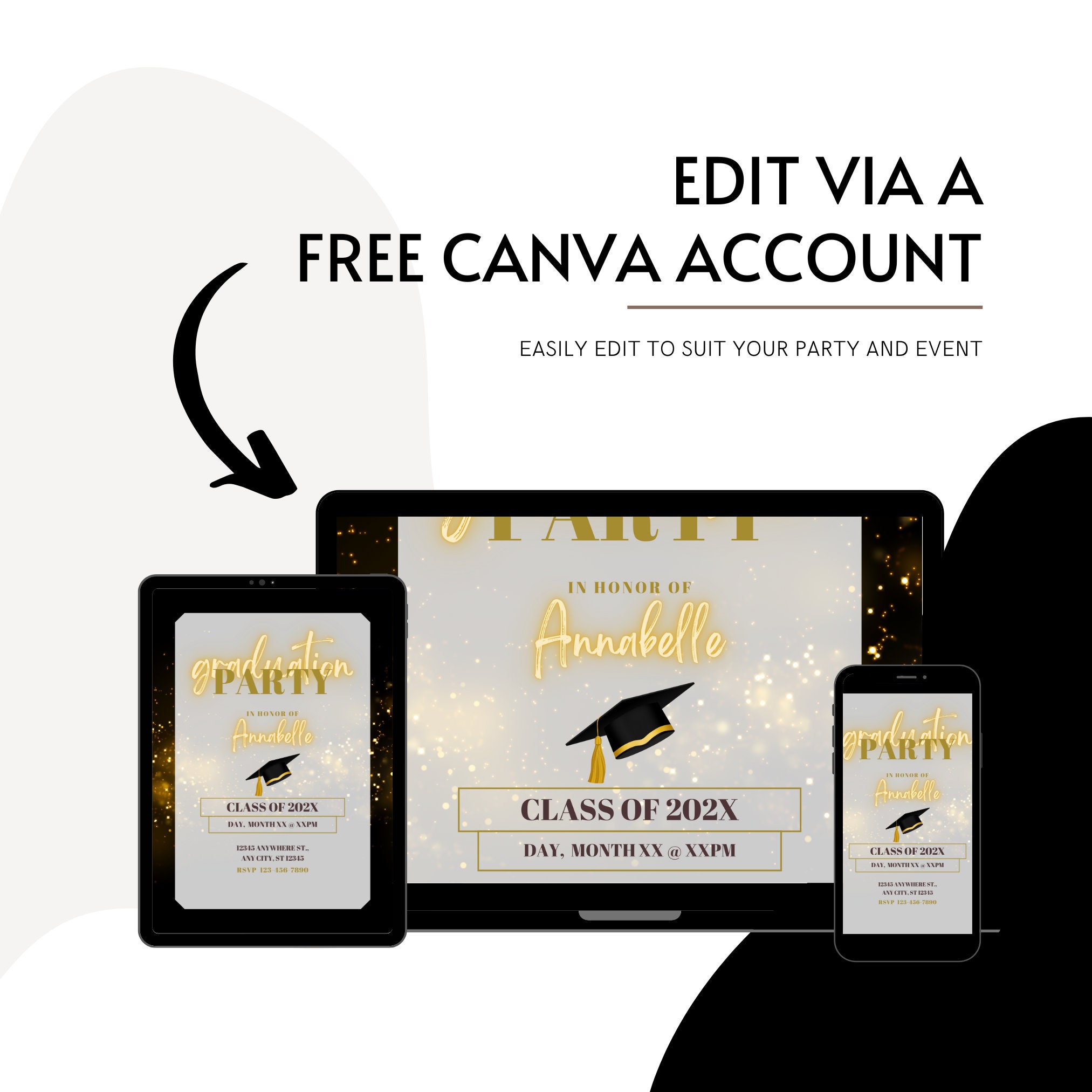 Editable Graduation Party Invitation, Black Gold Glitter (digital Evite ...