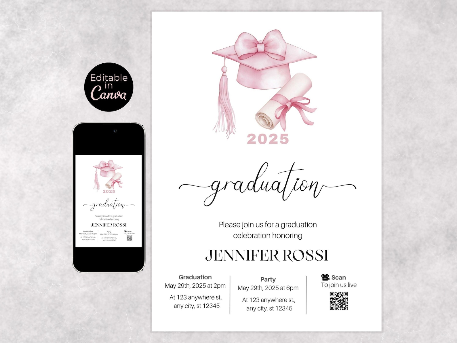 Pink Bow Graduation Invitation Editable Canva Template Digital Grad ...