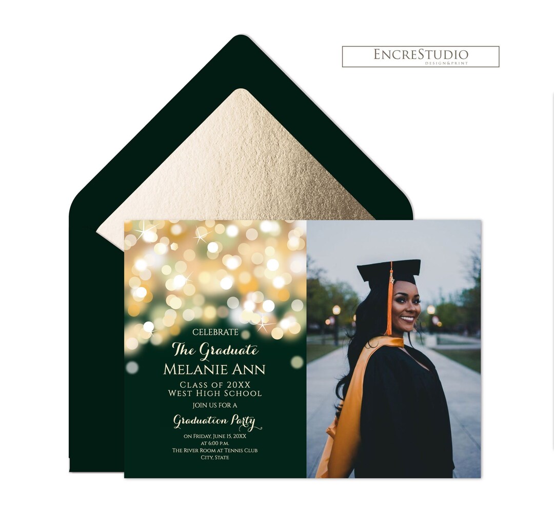 Graduation Invitation Editable Template, Gold and Green Bokeh ...