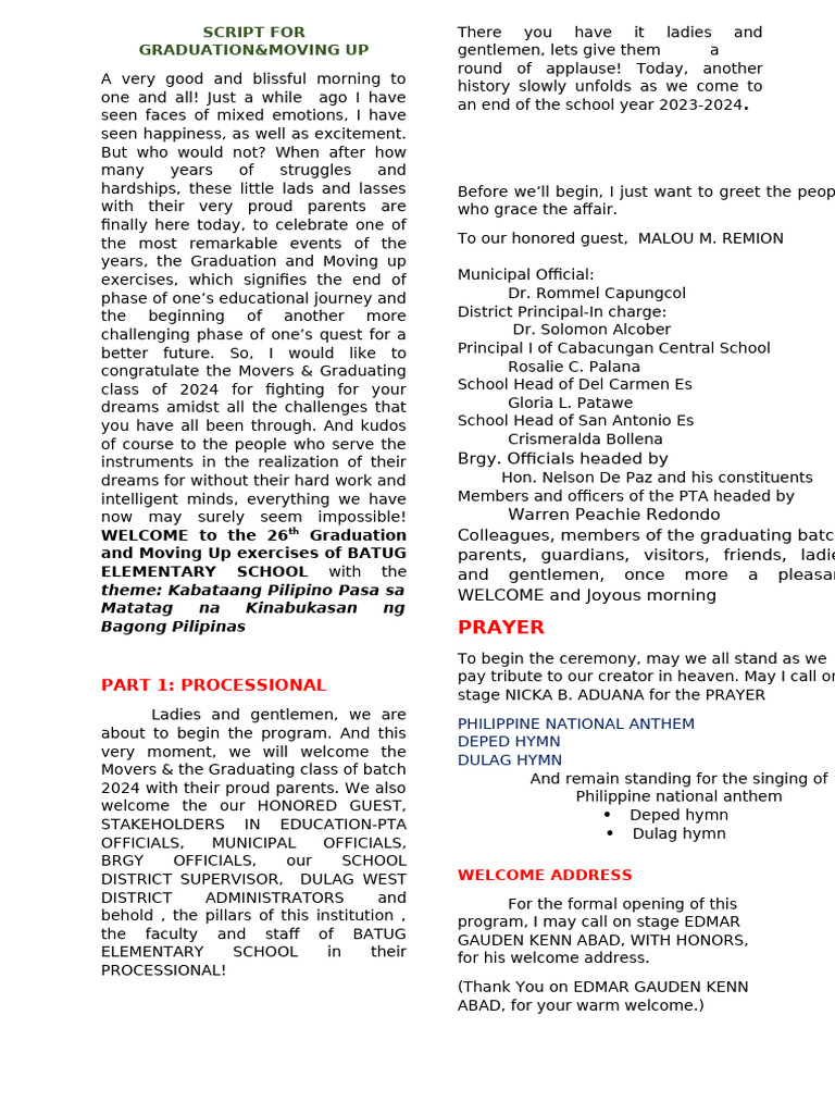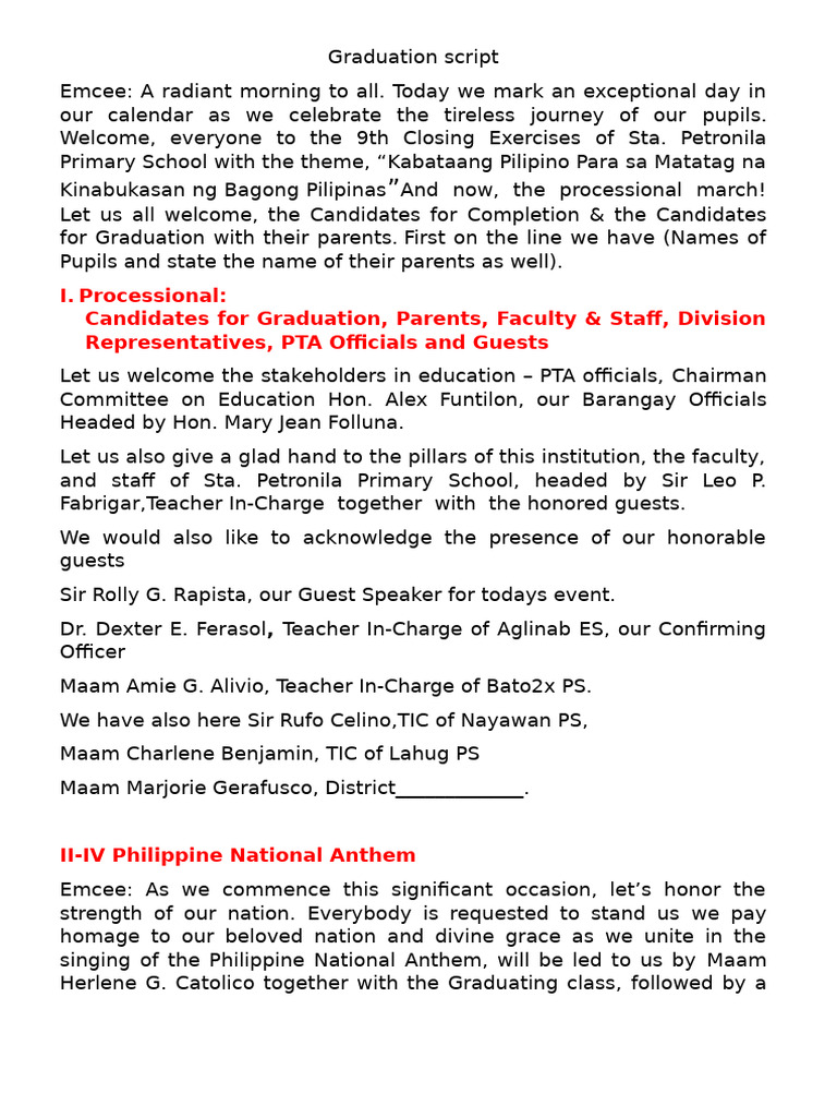 Graduation emcee script for Bagacay Elementary School 2025 - Studocu