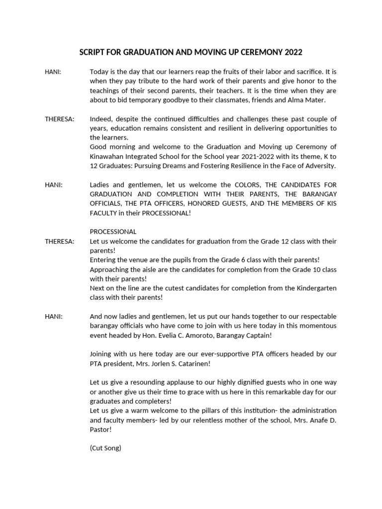 Script For Graduation and Moving Up Ceremony 2022 | PDF | Gratitude