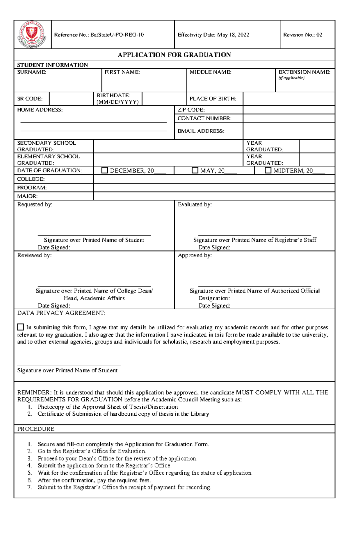 graduation form - Reference No.: BatStateU-FO-REG-10 Effectivity Date ...