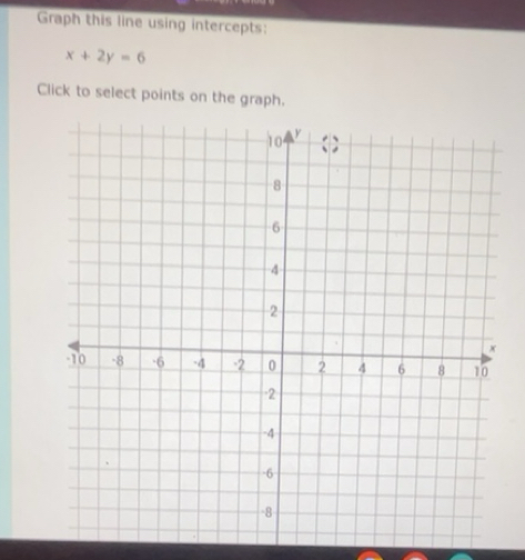 Solved: Graph this line using intercepts: x+2y=6 Click to select points ...