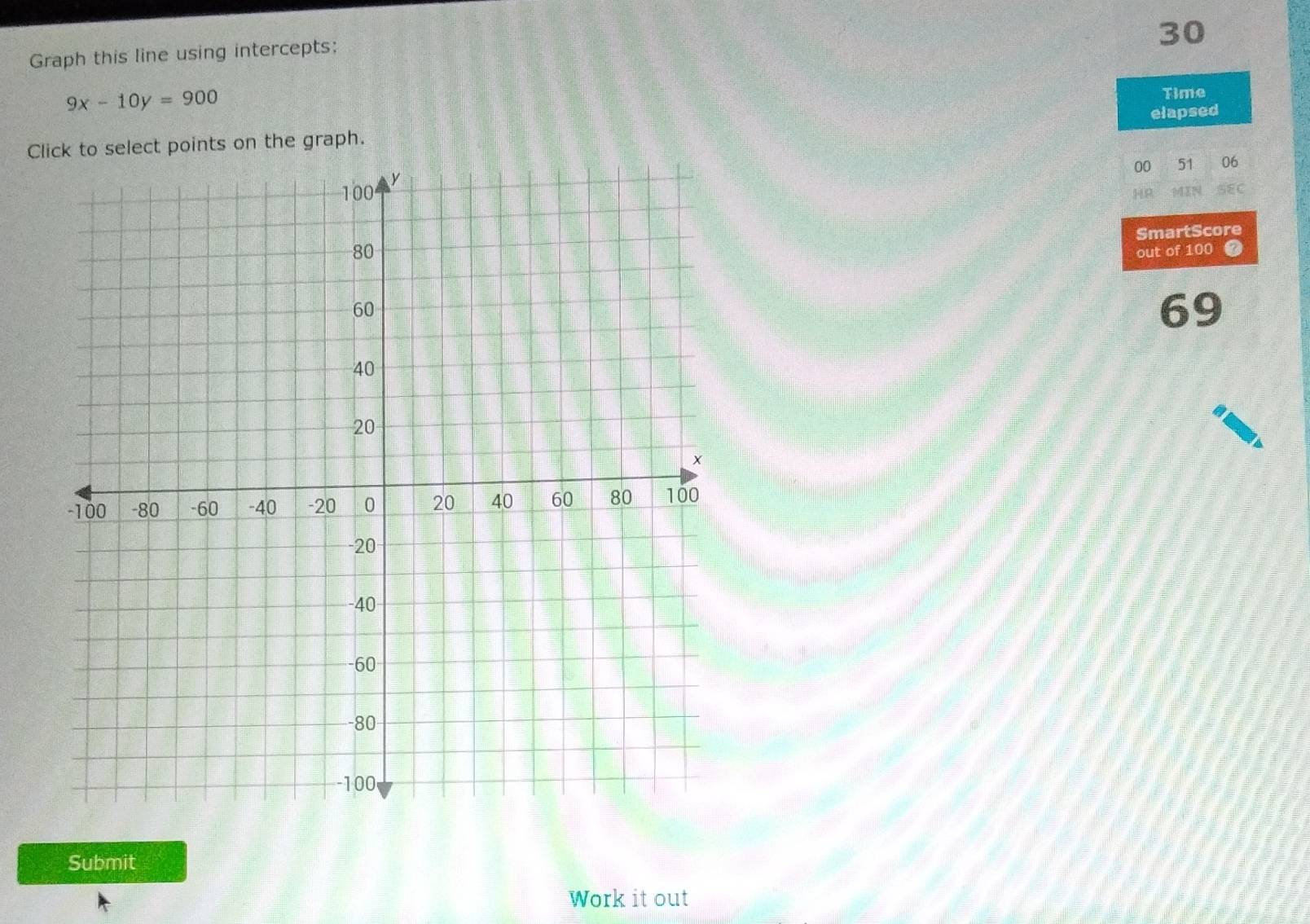 Solved: Graph this line using intercepts: 9x-10y=900 Time Click to ...