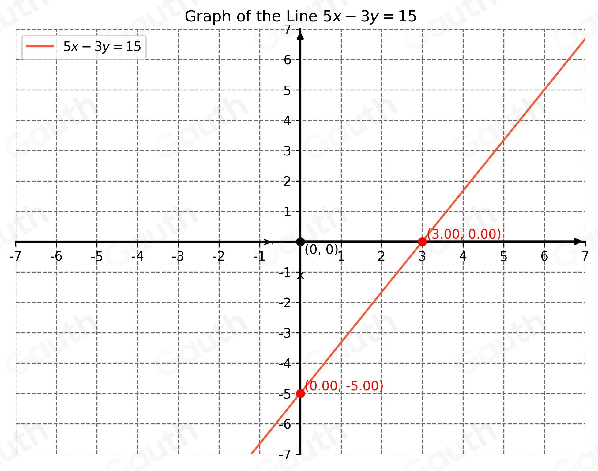 Solved: Graph the line represented by the equation 5x-3y=15 [Math]
