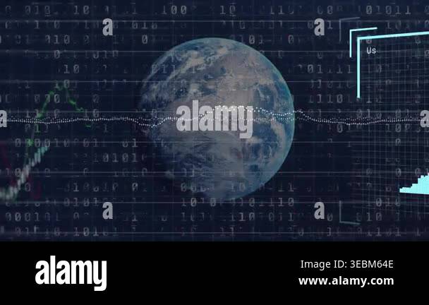 Animation of numbers, globe with tech icons and graphs on green ...