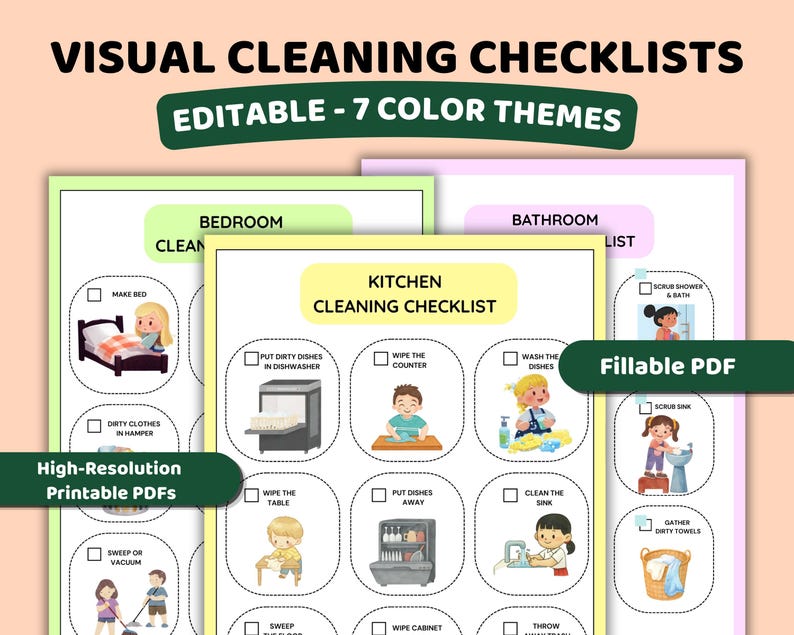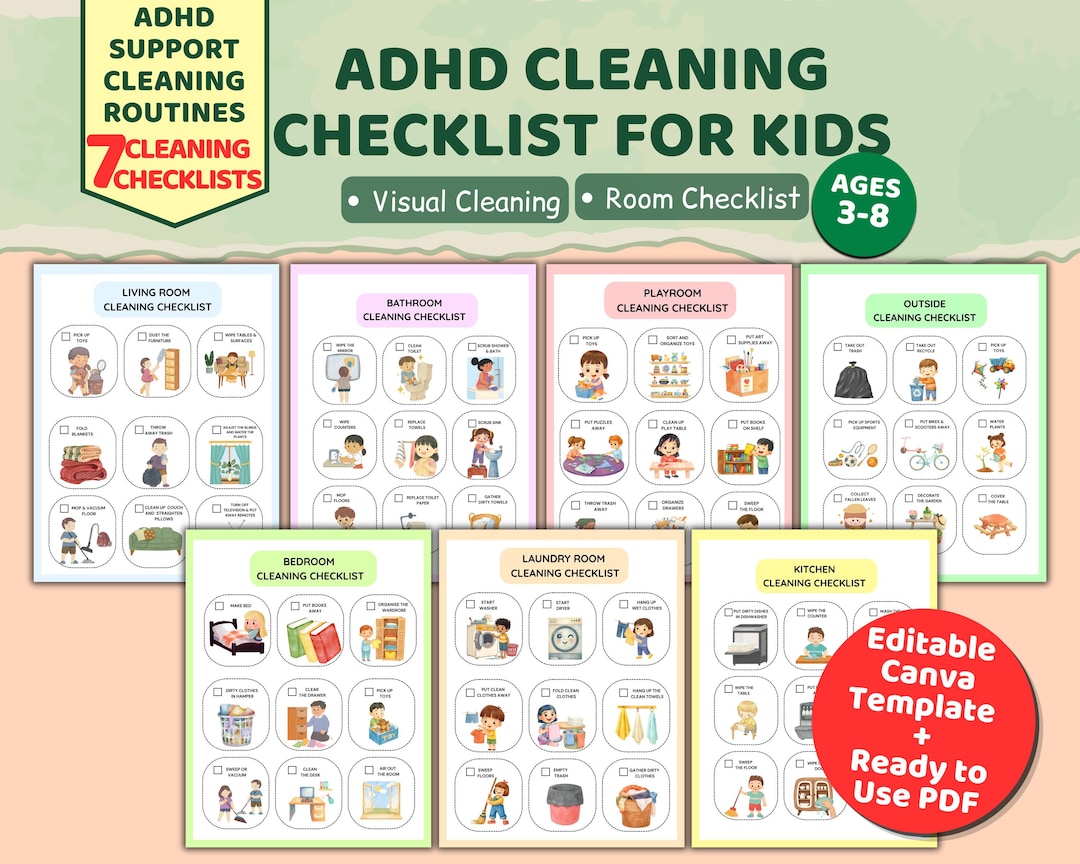 ADHD Cleaning Checklist for Kids Printable, 7 Room Checklist, Visual ...