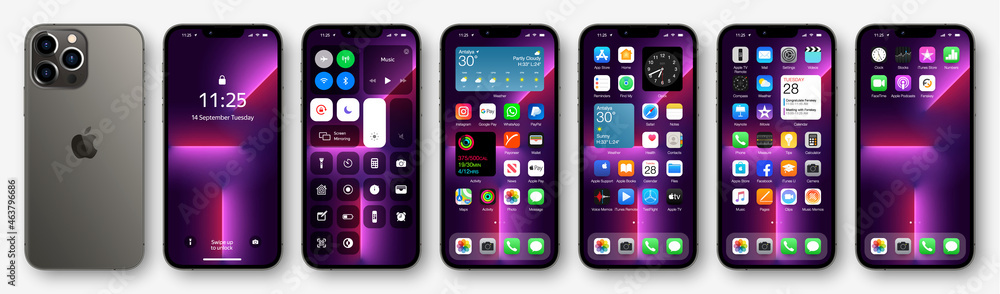 Smartphone Graphite color with open ios 15. Locked screen, phone ...
