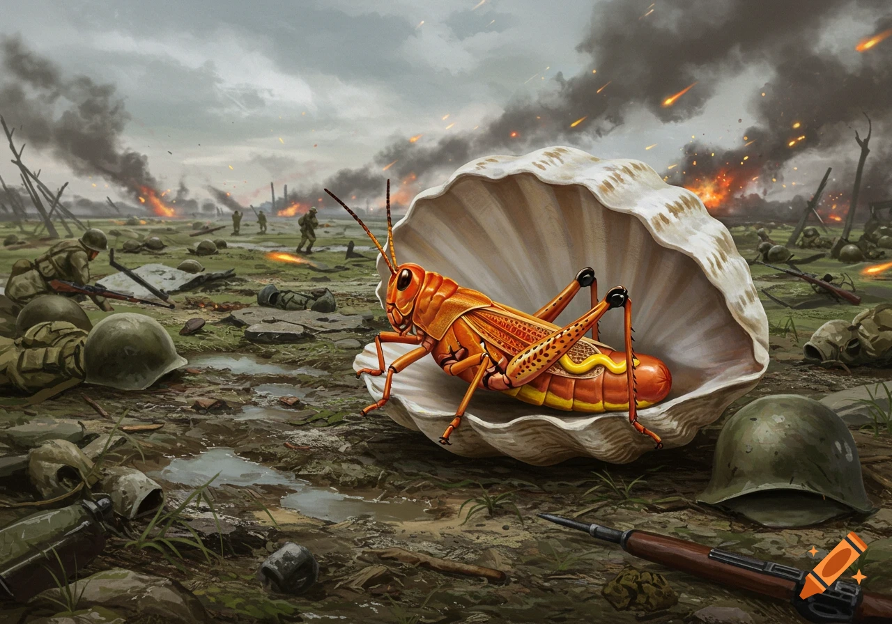 A giant orange grasshopper sits in a shell on a war-torn battlefield ...