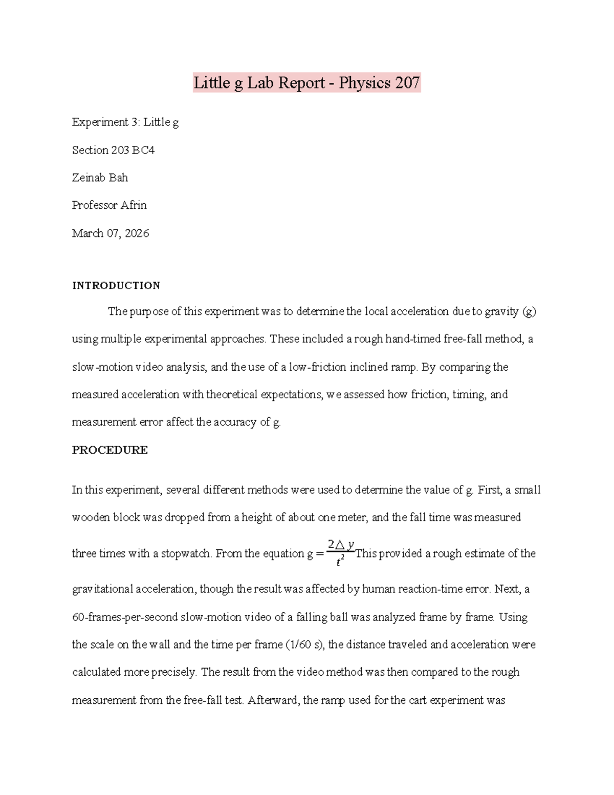 Physics 207 Lab Report: Experiment 3 - Measuring Local Gravity (g ...