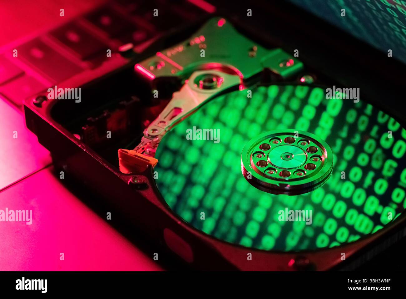 The computer code is displayed in green numbers on the open hard disk ...