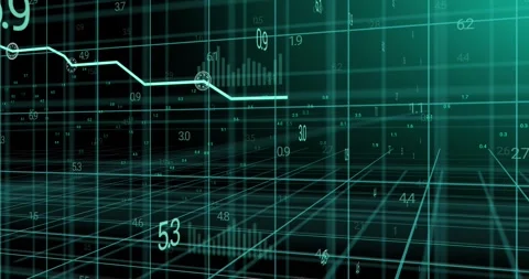 Animation of digital data processing over grid on dark background ...