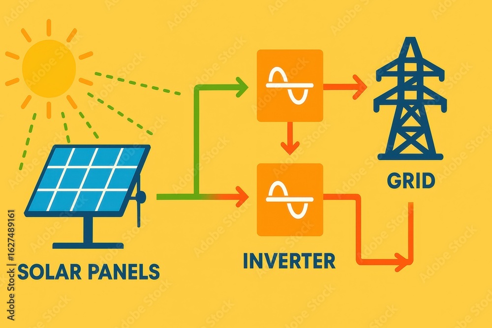 Infographic showing solar panels, inverter, and power grid connection ...