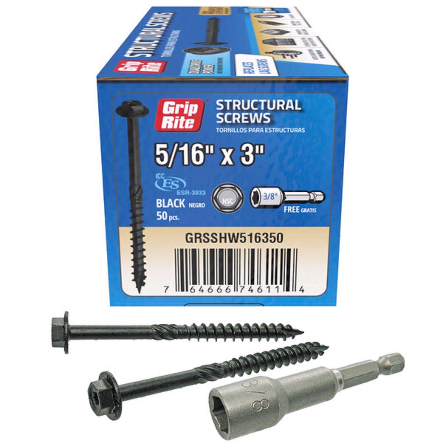 Grip Rite 5/16" x 4" Structural Screws, Hex Washer Head, Black (50/Box ...