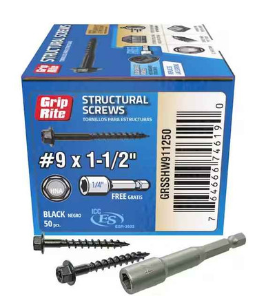 Grip Rite #9 x 1-1/2" Structural Screws, Hex Washer Head, Black (50/Box ...