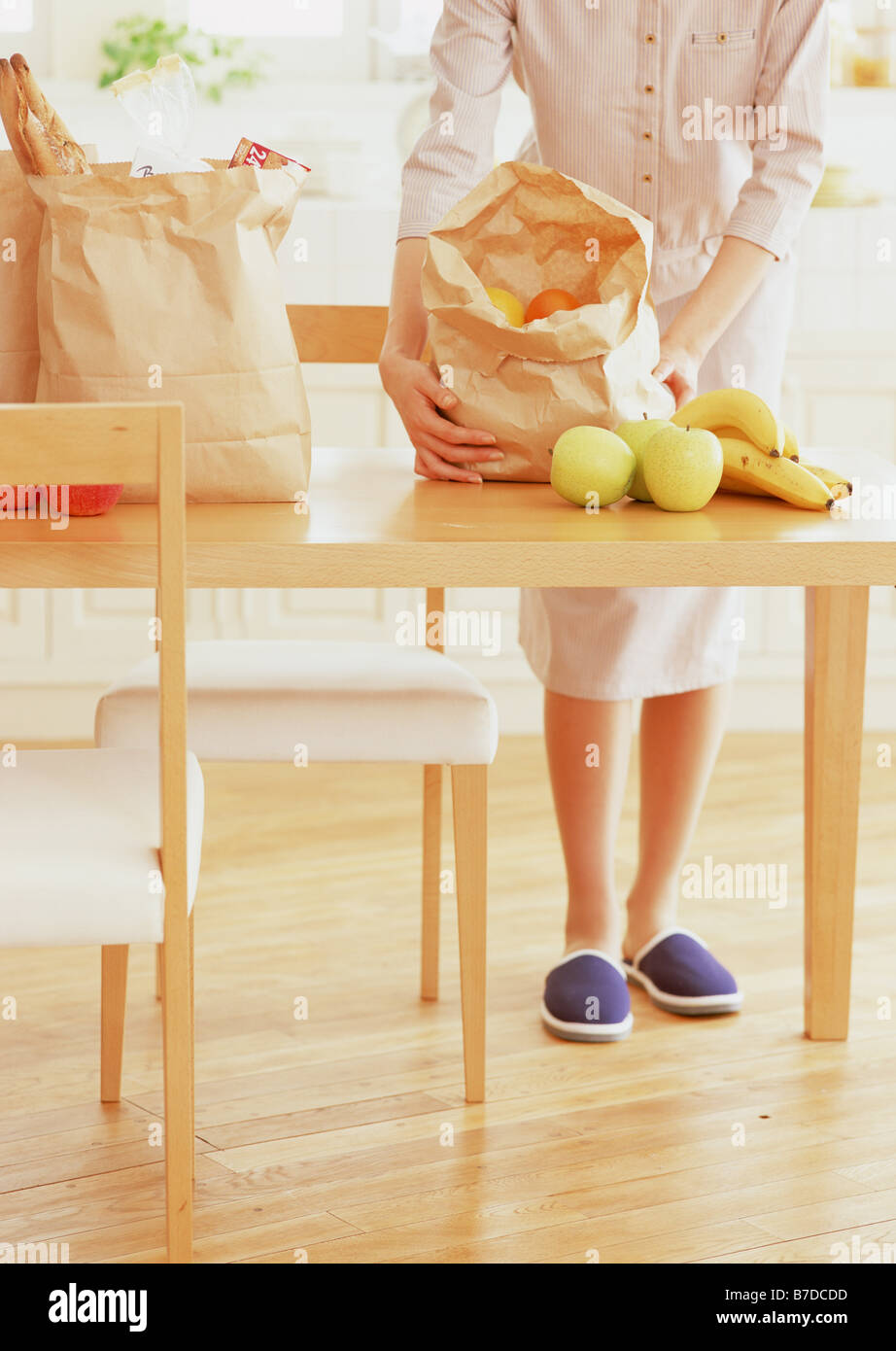 A pile of grocery shopping on a kitchen table Stock Photo - Alamy