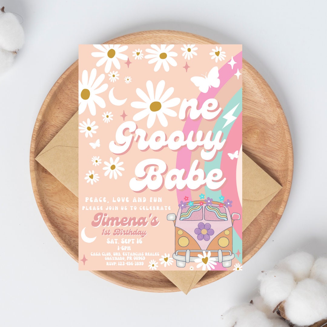 One Groovy Babe Birthday Invitation Hippie Van Editable Groovy One ...