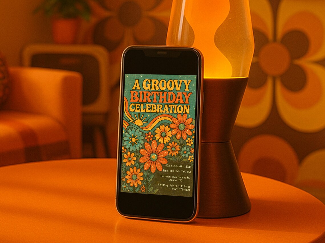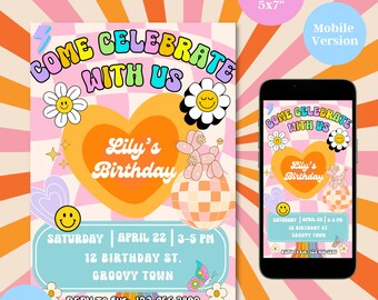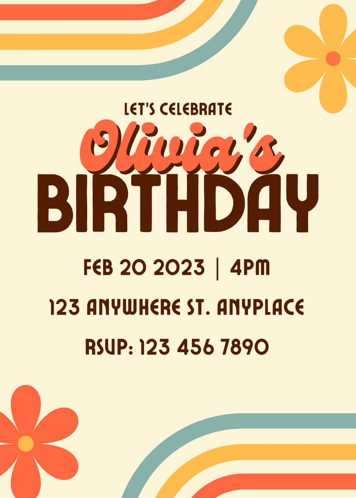Editable Groovy Birthday Invitation: Retro Floral 70s Party (digital ...
