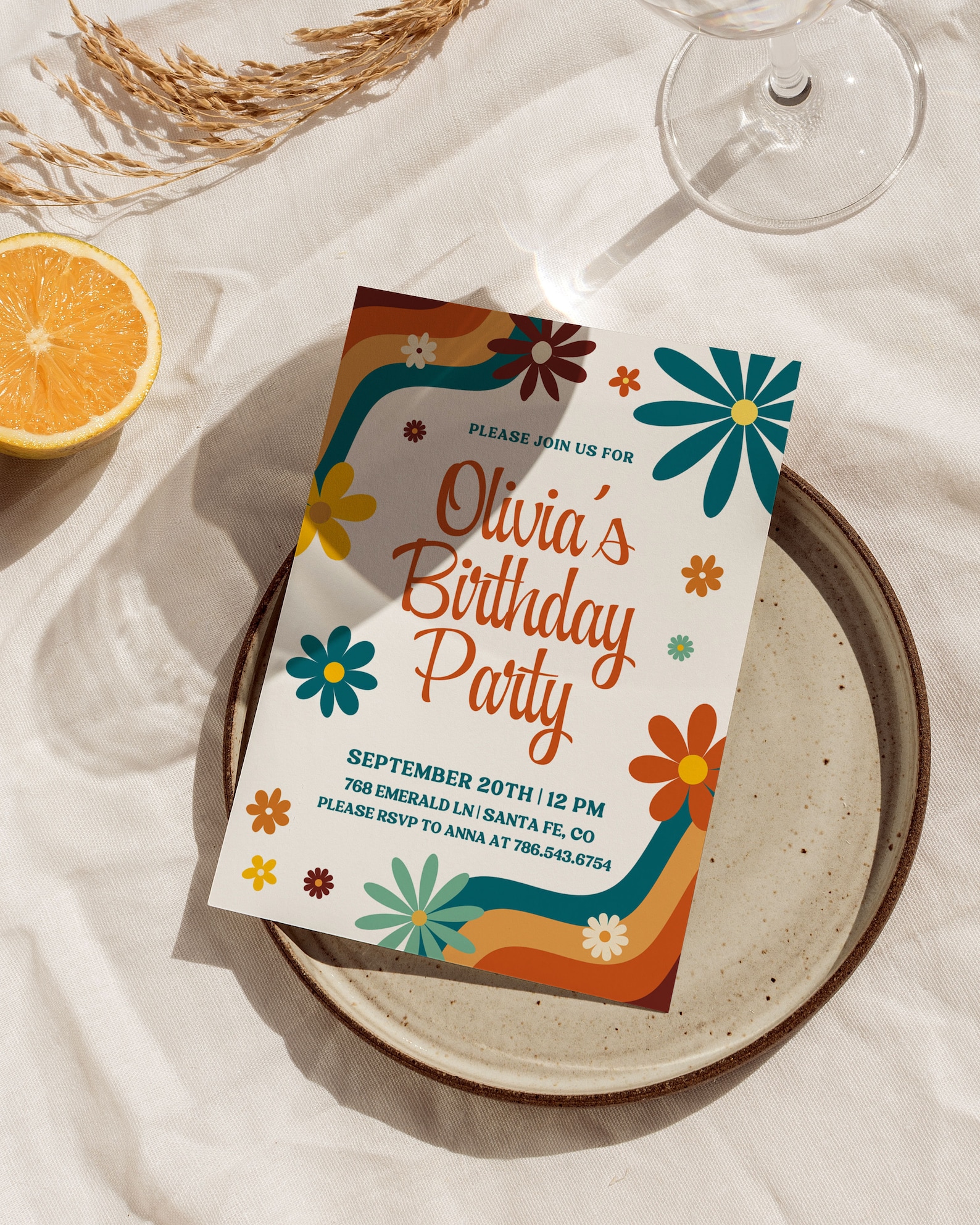 Groovy 70s Birthday Invitation: Retro Floral Party Template (digital ...