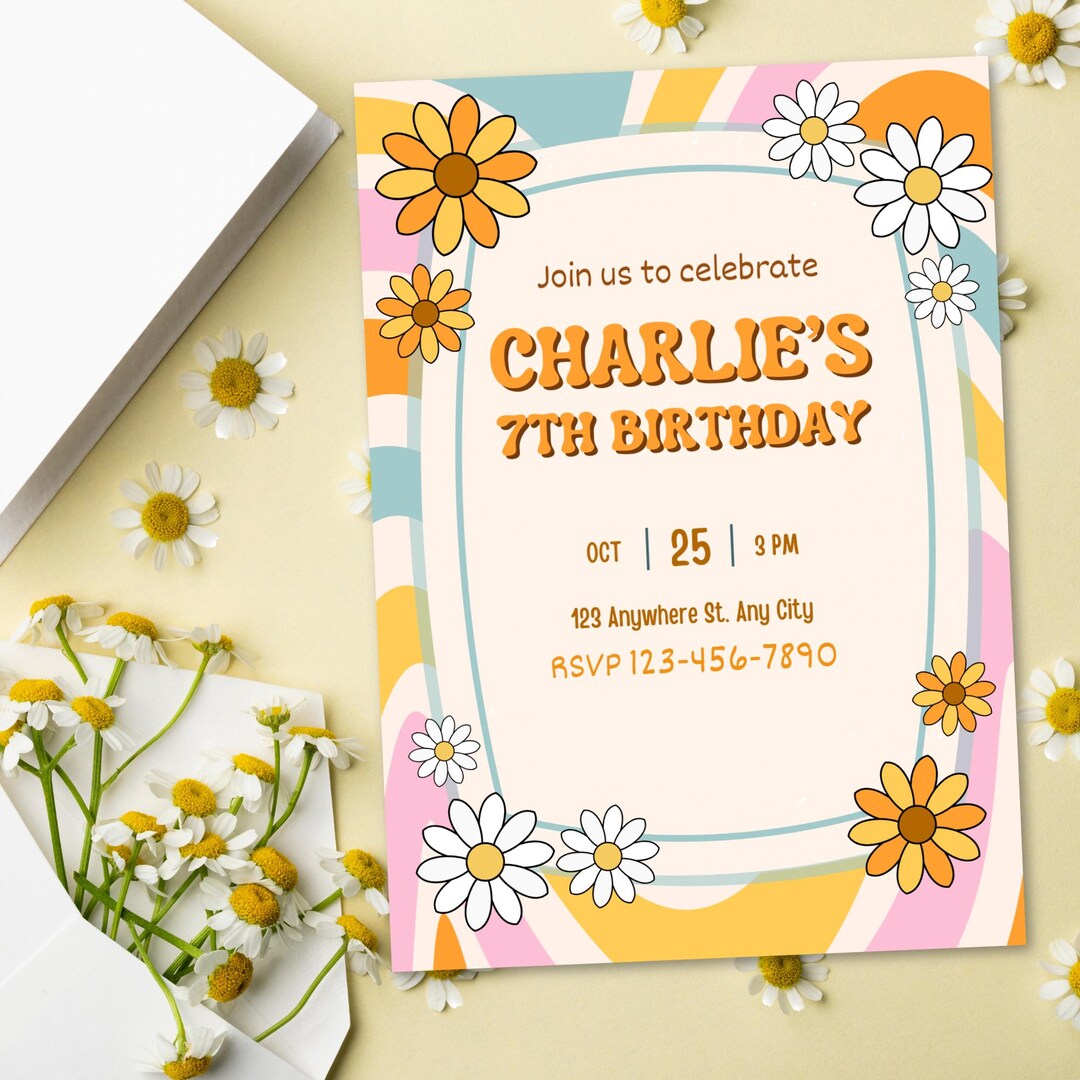 Retro Groovy Daisy Birthday Invitation Editable Template, Printable ...