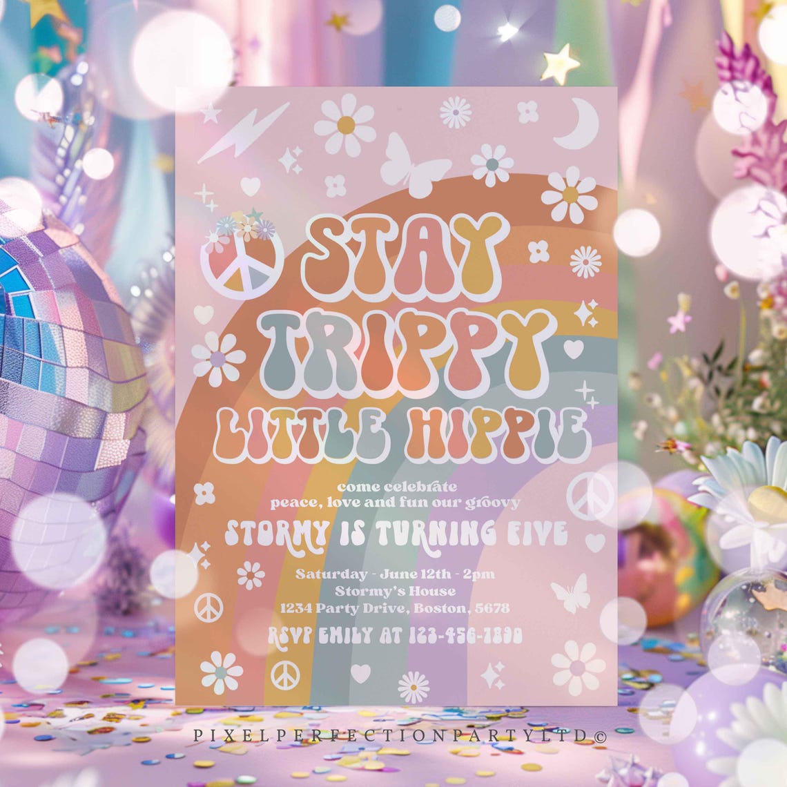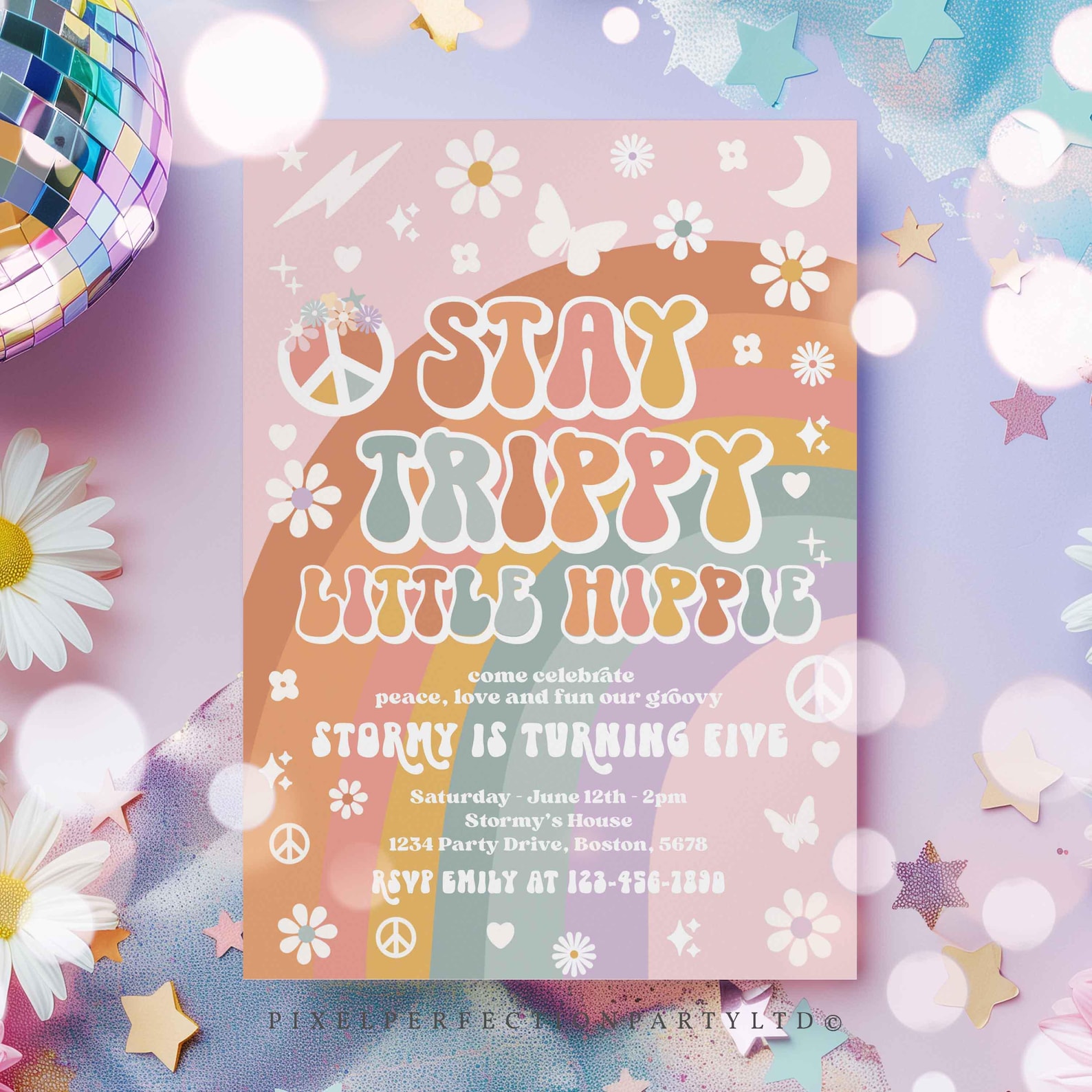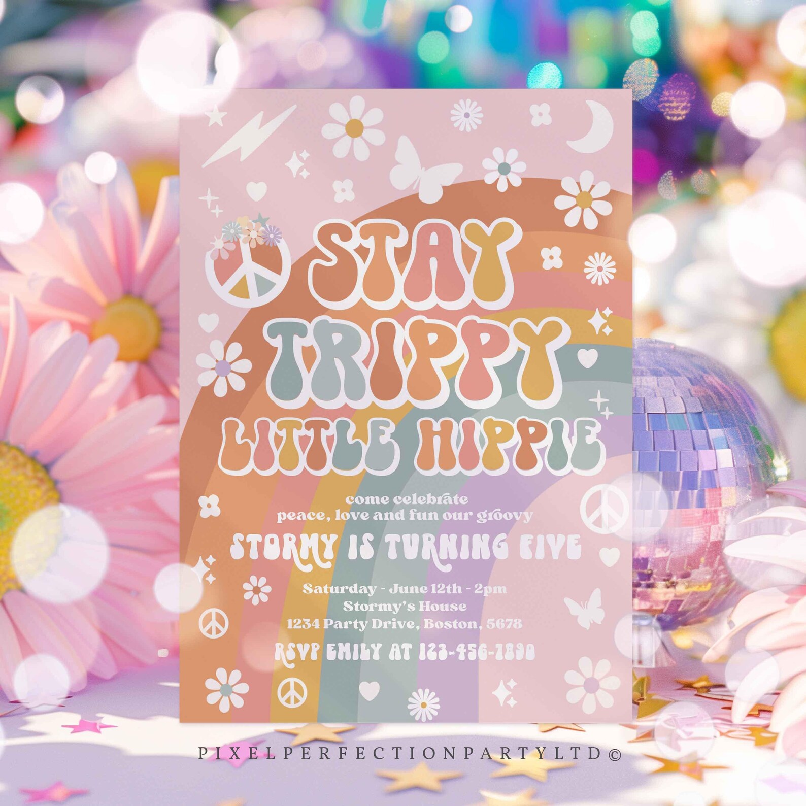 Editable Groovy Birthday Party Invitation Stay Trippy Little Hippie ...