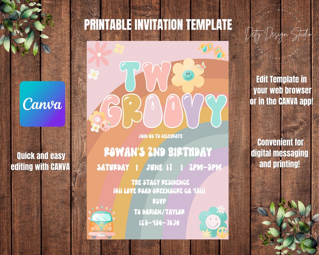 Two Groovy Birthday Invitation: Editable Canva Template (digital ...