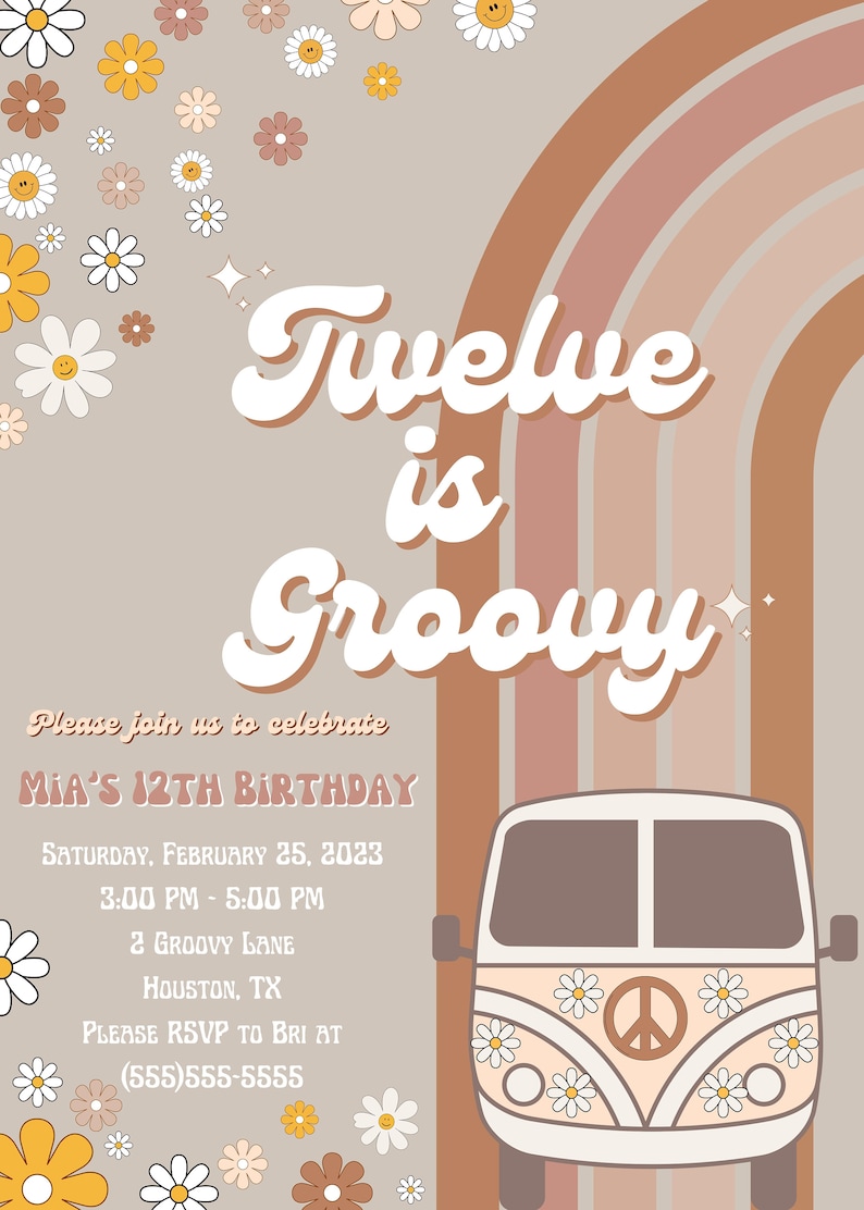 Groovy Birthday Invitation, Twelve is Groovy Invitation, Retro Hippie ...