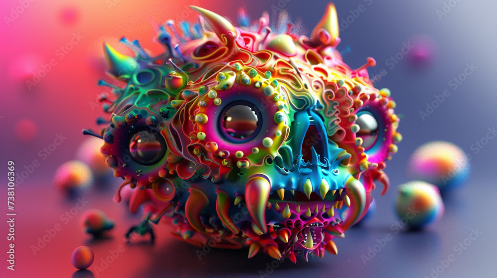 Generate a 3D render of a bizarre and grotesque object adorned with a ...